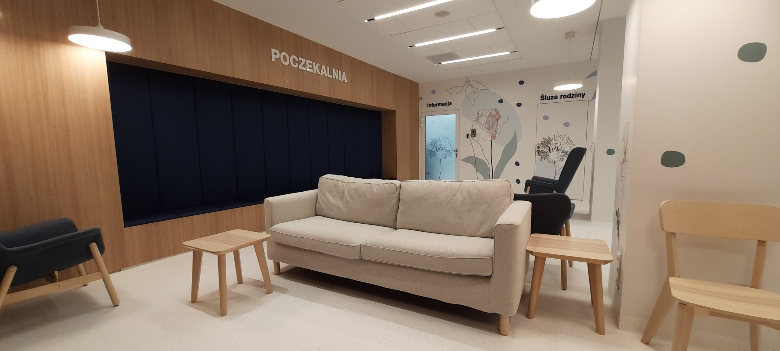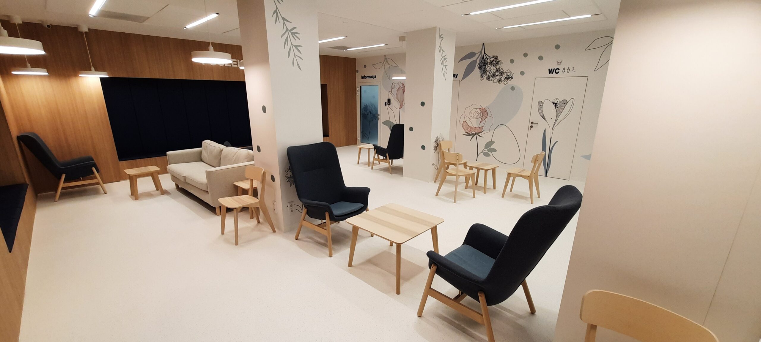 Właśnie dlatego zależało nam na stworzeniu unikalnego pomieszczenia. Poczekalnia nie wygląda, jak miejsce, w którym pacjenci czekają na wizytę, lub badanie lekarskie. Przypomina raczej przytulną świetlicę. Ściany zostały obudowane płytami meblowymi. Usiąść można na wygodnych siedziskach we wnękach, na kanapach i fotelach z IKEA. W urządzeniu Poczekalni pomogło nam Centrum Dystrybucyjne IKEA w Jarostach koło Piotrkowa Trybulskiego.
